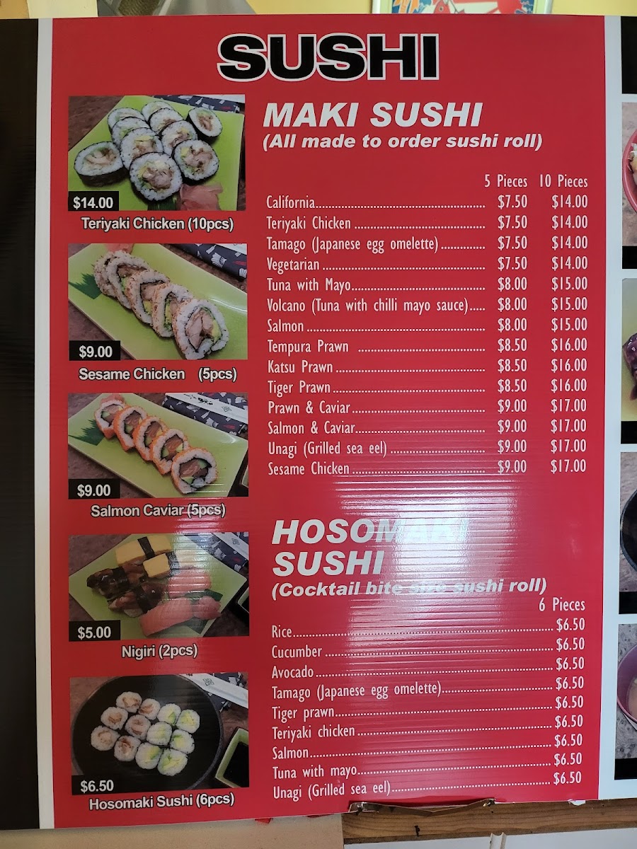 The Udon & Ramen section is another highlight, with comforting options like the Plain Udon, as well as the flavorful Teriyaki Chicken Udon/Ramen and Teriyaki Beef Udon/Ramen. Seafood lovers can enjoy the Prawn Tempura Udon/Ramen, while the crispy Chicken Karaage Udon/Ramen adds a delightful crunch to the dish.